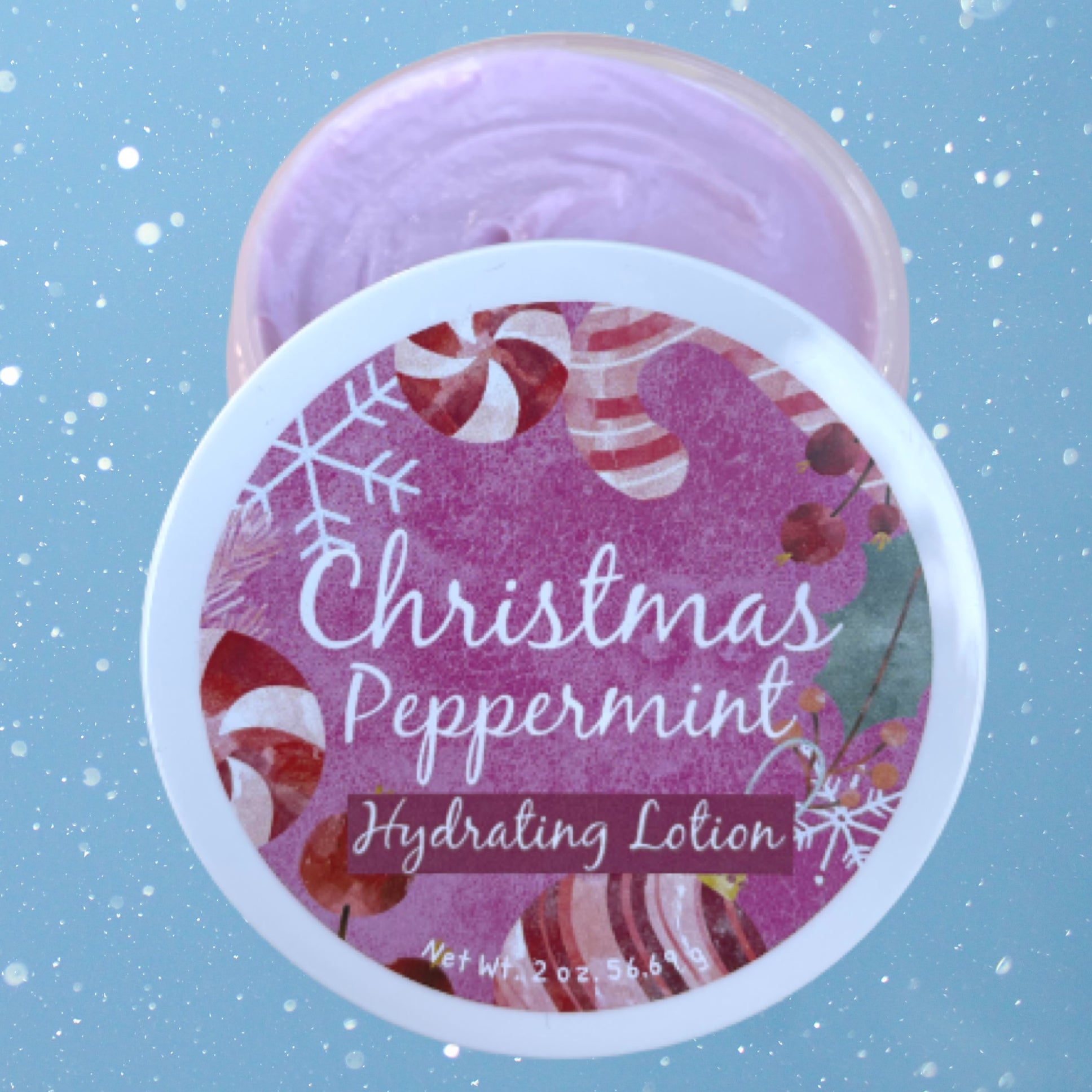 Our Christmas Peppermint lotion is a silky smooth hydrating lotion, scented like a Christmas candy cane. The perfect stocking stuffer idea. With the cold winter weather, it is the perfect gift to keep the skin moist and smooth. Our formula is a non-greasy lovely lotion. 2 oz. jar
