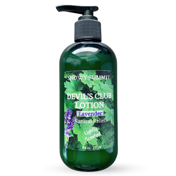 A silky lightweight lotion made with Devil's Club oil and Lavender oil. The Devil's Club plant is commonly found in the Rainforest of Southeast Alaska and British Columbia. Known for its medicinal qualities, Devil's Club is a natural anti-inflammatory. Lightly scented with Lavender oil. 8 oz. bottle