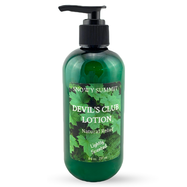 A silky lightweight lotion made with Devil's Club oil. Devil's Club is a natural anti-inflammatory. Lightly scented. 8 oz. bottle