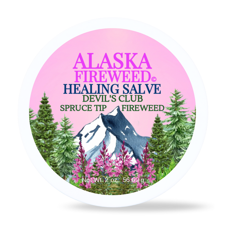 Introducing our new Rainforest Fireweed collection. Our Devil's Club Rainforest Fireweed Healing Salve is infused with Devil's Club oil, fireweed oil and spruce tip oil. The Rainforest Fireweed Salve is lightly scented and has been curated to relieve and soothe.