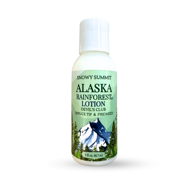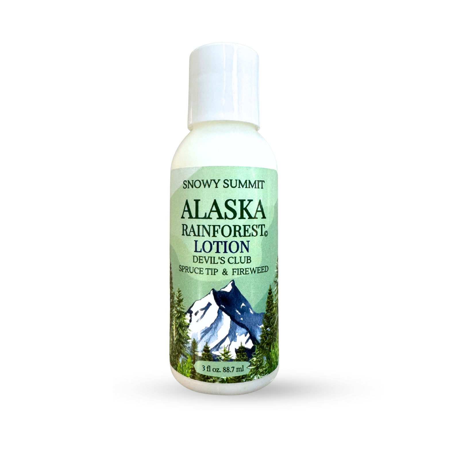 Our Devil's Club Rainforest Lotion 3oz. is infused with Devil's Club oil, fireweed oil and spruce tip oil. The Rainforest lotion is lightly scented and has been curated to relieve and soothe.