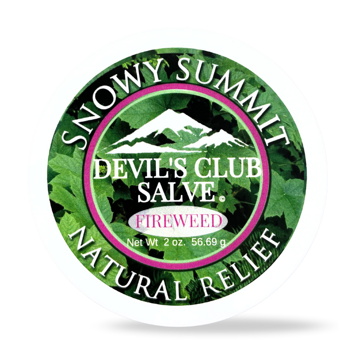 Our Fireweed Devil's Club Salve is an all-natural pain reliever. A great natural salve made to help relieve pain and reduce inflammation in joints and muscles. Massage this natural salve onto achy joints and muscles to help reduce pain and inflammation. Enjoy the scent of fireweed and the skin-soothing benefits of the combination of these two amazing plants to help heal dry skin.