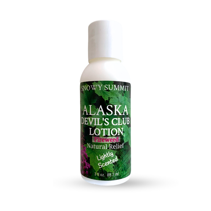 A silky lightweight lotion made with Devil's Club oil, infused with Fireweed blossoms. Devil's Club is a natural anti-inflammatory. Lightly scented. 3 oz. bottle
