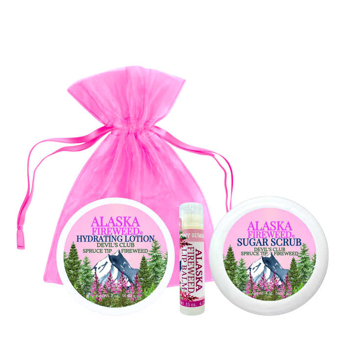 Fireweed Gift Set is a curated three-piece collection including everything you need: an invigorating sugar scrub to slough away dullness, a rich lotion to lock in moisture, and a protective lip balm to keep lips soft and supple. Give yourself, or someone you care abou the gift of radiant, pampered skin.