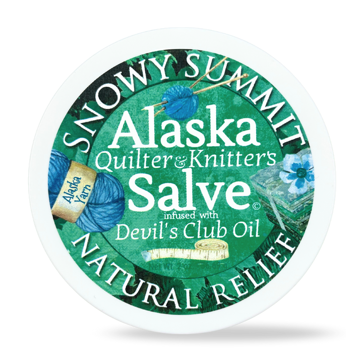 Our Quilter & Knitter's Salve is specifically formulated to absorb quickly and easily to relieve tired and sore hands, muscles, and joints while softening the skin at the same time. Massage this healing salve into dry cracked skin and achy joints and muscles to help reduce pain and inflammation. Enjoy the sweet uplifting scent and the moisturizing skin-soothing benefits of our Quilter & Knitter's salve that has been infused with oil from the Devil's Club plant. This salve is packed with healing & moisturizing benefits! 2 oz jar